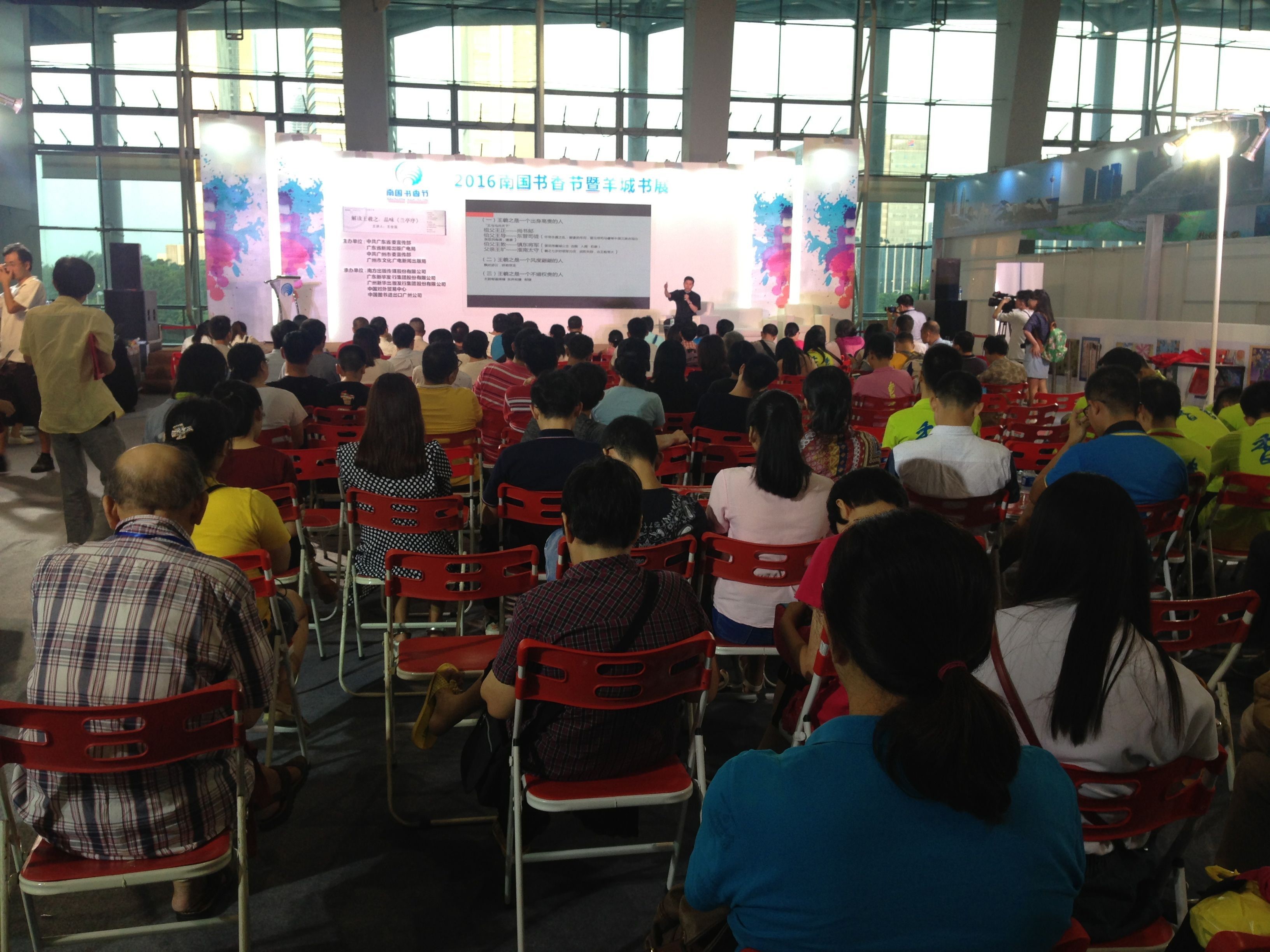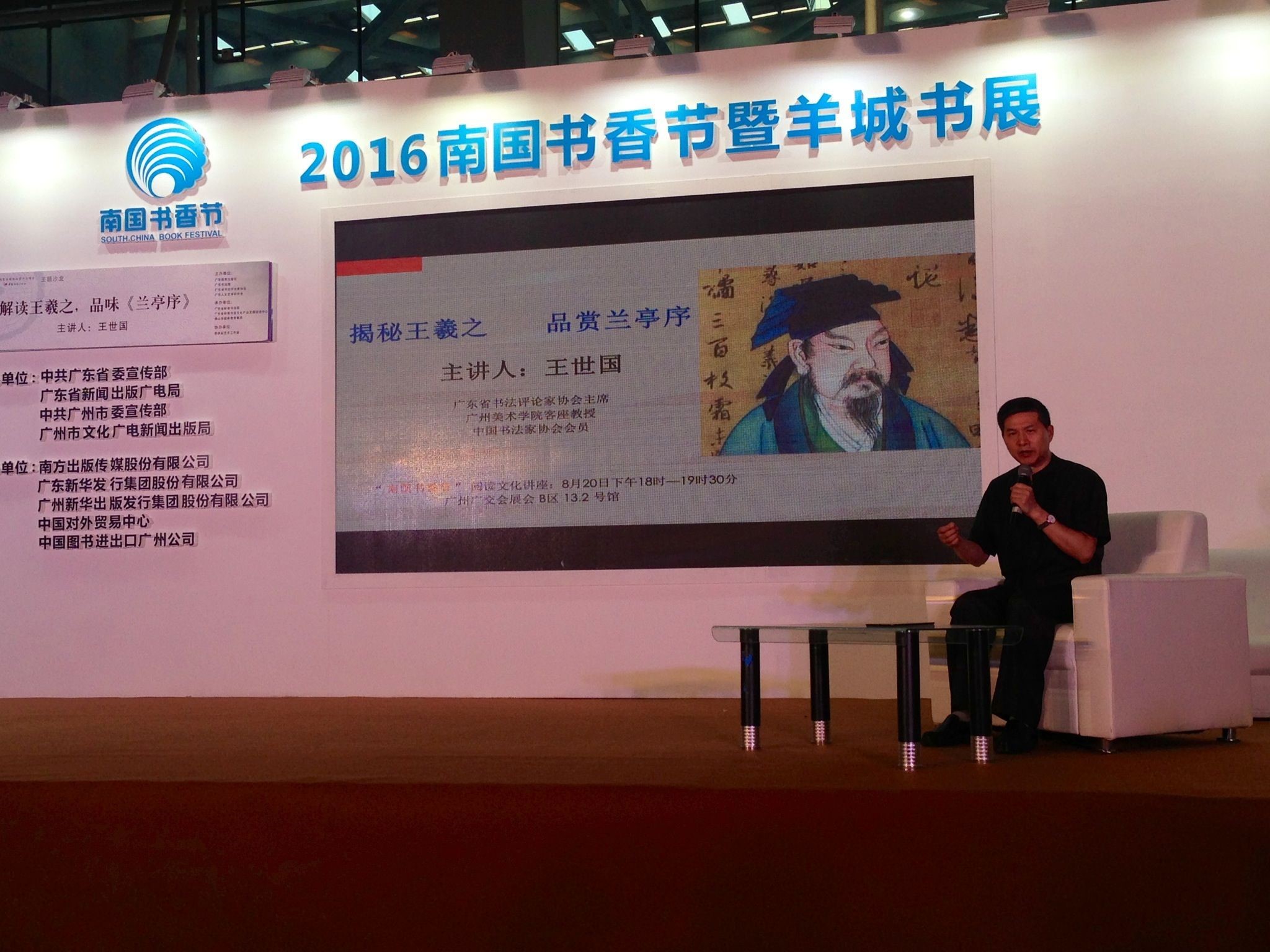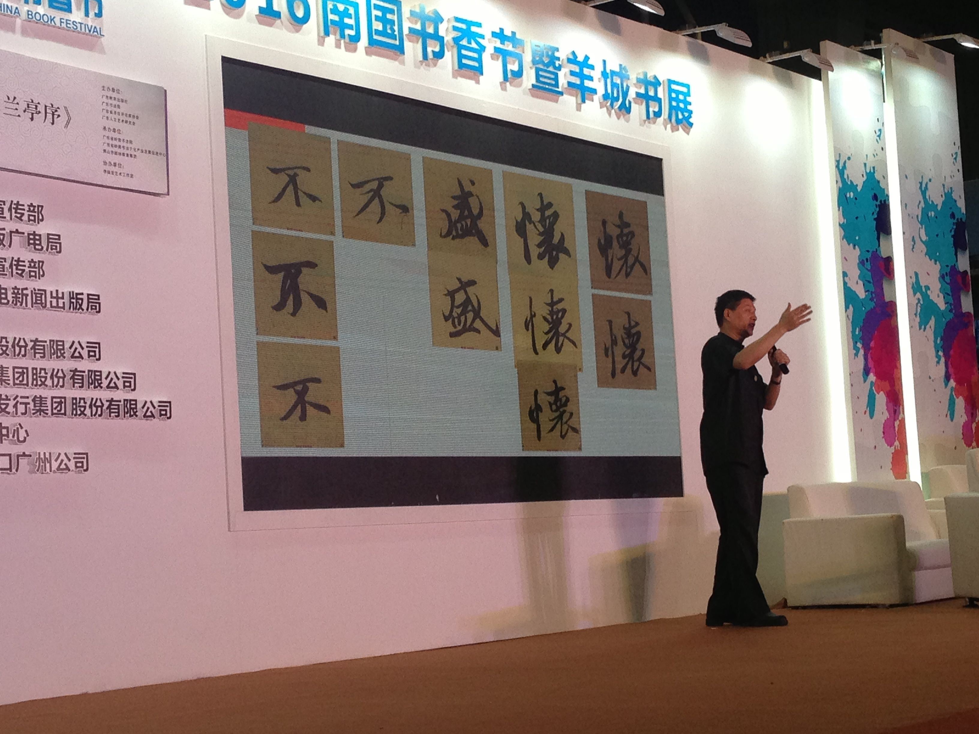 一年一度的“南国书香节”在广州进出口商品交易会会展中心隆重开幕,在广东省省委宣传部、广东省新闻出版广电局、广州市市委宣传部、广州市文化广电新闻出版局主办的“名人讲堂”上,名家荟萃,“大咖”云集,为前来参观购书的市民奉上了一场场精彩的文化盛宴。昨天下午,八公山人王世国先生应邀在“南国书香节”上,为广大读者做了题为“解读王羲之,品赏兰亭序”的精彩讲座。