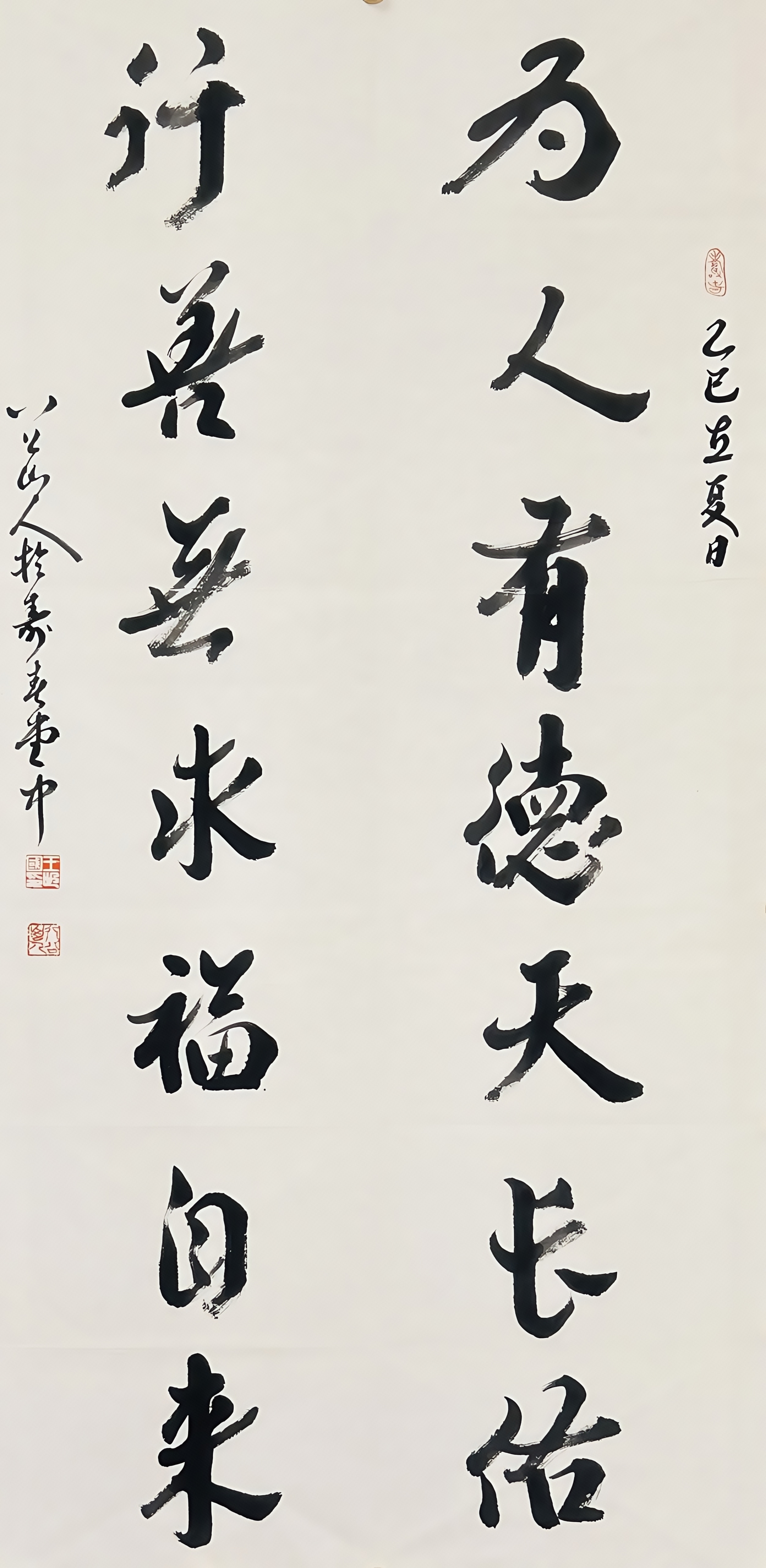 行书七言对联:“为人有德天长祐,行善无求福自来”