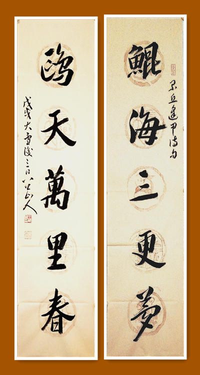 八公山人四尺行书五言联:鲲海三更梦,鸥天万里春