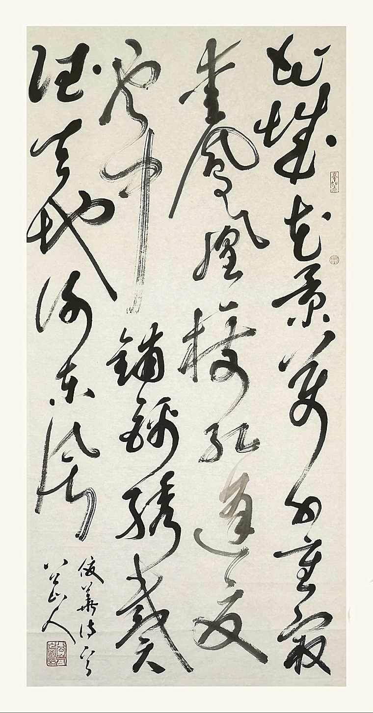 岭南有凤凰树,叶如飞凰之羽,花若丹凤之冠。凤凰花春后始开,高入云天,绚丽夺目,实乃夏花之王! 夫人戏作小诗《凤凰花》,今以四尺整纸狂草书之: 花城花景万千重, 最爱凤凰一树红。 逢夏云中铺锦绣, 戴德天地谢东风。