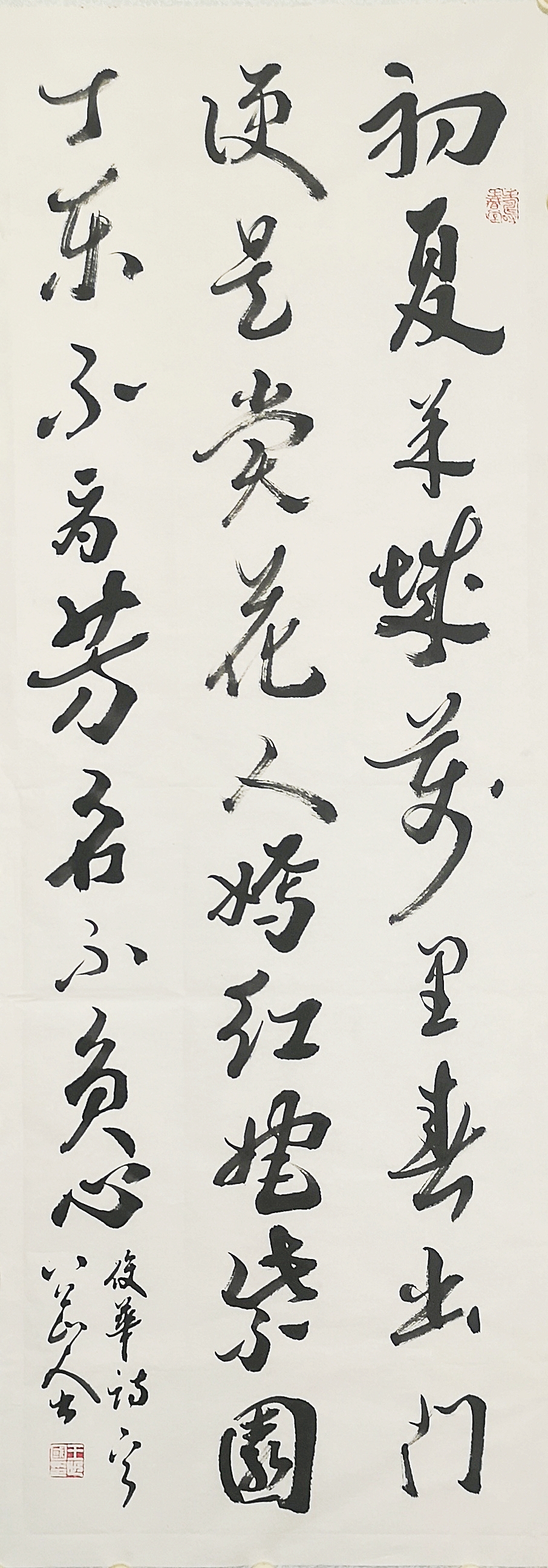 行草条屏《杨俊华·初夏花城》:“初夏羊城万里春,出门便是赏花人。嫣红姹紫园丁乐,不辱芳名不负心。”