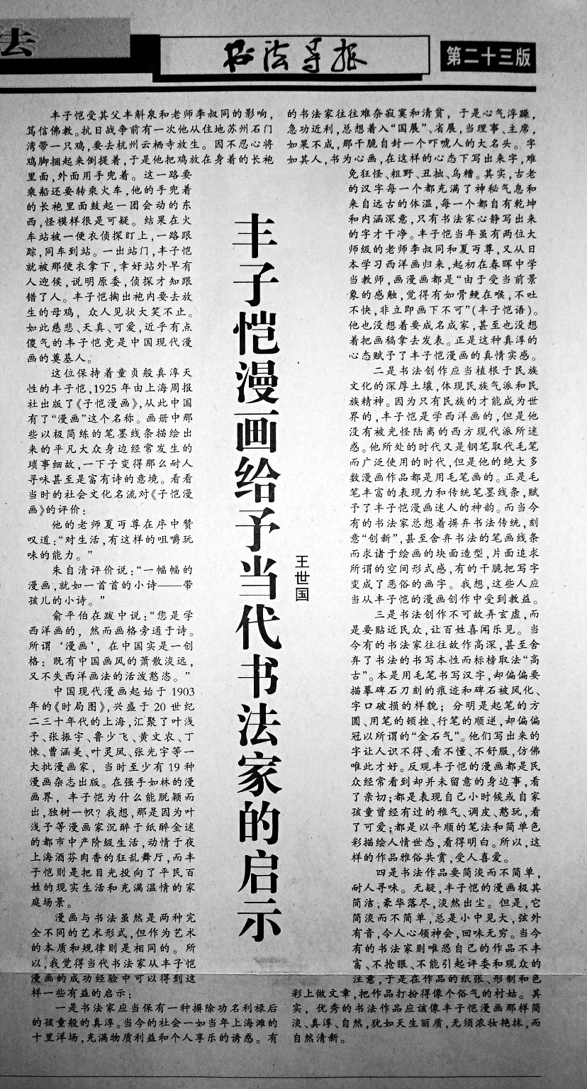 漫画与书法虽然是两种完全不同的艺术形式,但作为艺术的本质和规律则是相同的。所以,我觉得当代书法家从丰子恺漫画的成功经验中可以得到这样一些有益的启示: