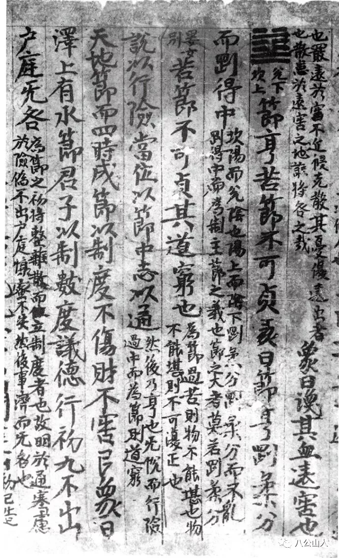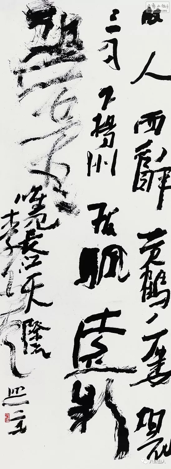 看起来它完全不像是一幅书法作品,而像是一个根本不懂书法,没有受过笔法和结字训练的人,信手涂鸦,胡乱写下的丑拙字迹:字形大小不一,字势歪歪倒倒,甚至难以认识;字的排列也是有的松散、有的紧密,甚至上下相接、笔画重叠;墨色也是有的字浓润处成了“墨猪”,有的则干枯得几乎看不清字形。作品表现出来的基调仿佛是一个初学者的笨拙、粗野、破败。这的确是数千年书法传统中从来没有过的状貌。比起书史上的杨凝式、徐渭、倪元璐、杨维桢等人的书法荒率表现来,有过之而无不及。