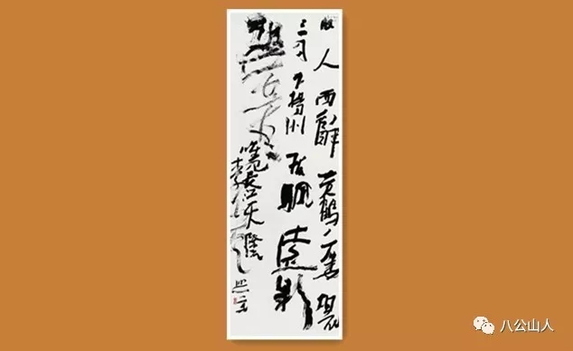 “故人西辭黃鶴樓,煙花三月下揚州。孤帆遠影碧空盡,唯見長江天際流。”孙过庭说:书法开篇第一字为全篇定下基调,“乃终篇之准”。可是偌大的条幅,开头“故”字却写得很小,导致后面“辞”“帆远影”“碧空尽”等,必须写大,才能撑满全篇;“唯见长江天际流”句,并没有按照上面三字的中轴线写下来,而偏向左侧;“李白一首”的题款,明明左右已没有了空间,可偏偏还要把它写大,“白”字笔画已经与右边的“天”字重叠。每行字排列分布也不均匀,开始还是字字独立,后来“黄鹤”“烟花”便是上下牵连,而“碧空尽”更是复合为一体;“唯见长江天际流”与“李白一首”两行字又左右粘连,成为一体。